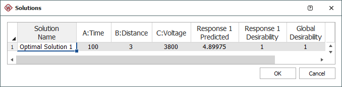 - In the Response Settings window that appears, use the settings shown next and click OK. These settings indicate that you want to maximize Response 1, with values above 4.89975 being considered 100% desirable and values below 2 being undesirable.