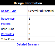 In addition to the Design Type, Responses, Factors and Replicates you chose for the design, the following calculated values are shown:
