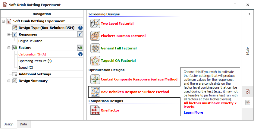 If a design is red, then one of the current factor settings is incompatible with it. When you select a red design type, the factor(s) it is incompatible with will become red as well. To find out why the setting is incompatible, read the design type's description. For example, the red text in the design description below says, "All factors must have exactly 2 levels," which indicates that the Carbonation factor (also shown in red) does not have the required number of levels for a Box-Behnken design.