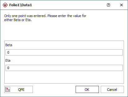 If you select to use a 2-parameter distribution, you will then be prompted to enter a value for one of the parameters. Remember that when using free-form data, you are supplying both the X and Y position for the entered data point. Given this point and a value for one of the parameters, the application will then solve for the other parameter. The parameter that you would like to solve for should be left as zero as shown below.