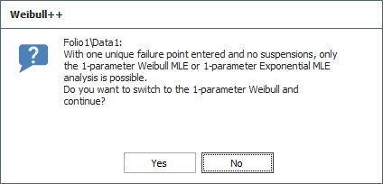 With only one unique data point, only the 2-parameter Weibull, 1-parameter exponential, 2-parameter exponential, normal and lognormal analyses are possible. If you select a different distribution, a message box will appear notifying you that you need to switch analysis types, as shown next.