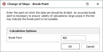 Return to the data sheet. In the Calculations Options area of the control panel, select the Change of Slope option, and then click the Calculate icon. This opens the Change of Slope - Break Point window, which allows you to specify the point at which the data set should be divided. Enter a value of 400, as shown next.