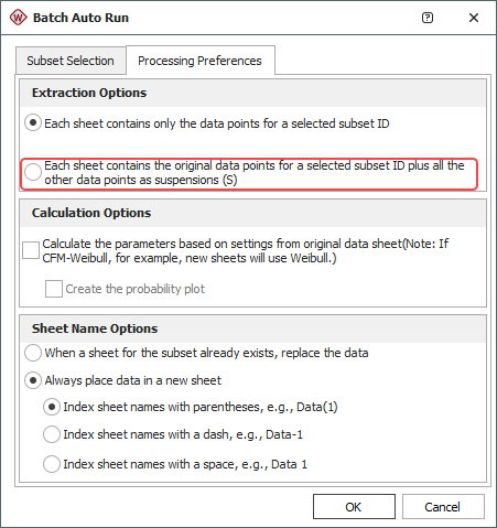 The first step is to analyze separately the data due to each mode. When you analyze the data set of a particular mode, the failure times for all other competing modes are considered to be suspensions. This captures the fact that those units operated for a period of time without experiencing the failure mode of interest before they were removed from observation when they failed due to another mode. You can easily perform this step via the Batch Auto Run utility. To do this, follow the steps below: