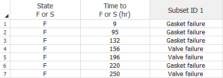 Consider a water pump that is considered failed when either its gasket or its valve fails. To use CFM analysis in a Weibull++ life data folio, you must categorize each failure time into distinct subset IDs. The following data sheet shows the categorized failure times.