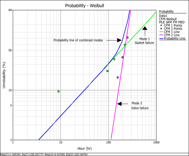 The Life Data Analysis Reference provides more information about competing failure modes analysis at: https://help.reliasoft.com/reference/life_data_analysis/lda/competing_failure_modes_analysis.html.