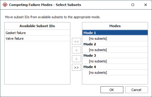 You can define up to four modes to include in the CFM analysis, and each mode can be associated with one or more subset IDs. (For example, consider a product with components A, B and C, where components B and C are identical, used in two places in the product and subjected to identical stresses. In this case, components B and C are expected to exhibit identical failure modes; therefore, they can be analyzed together and grouped under a single mode for CFM analysis.)