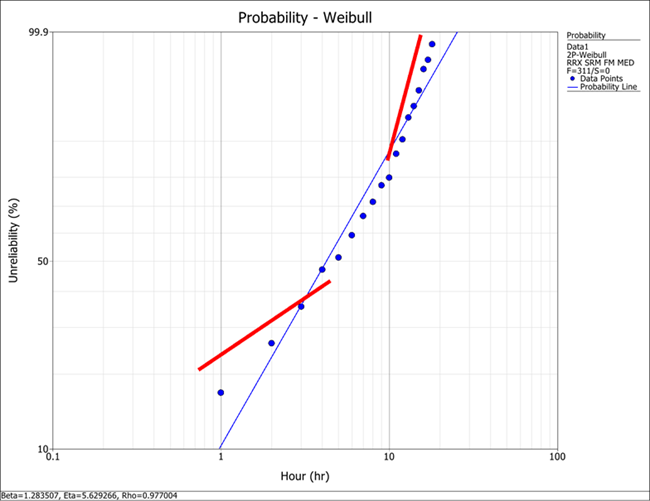 In effect this method is closer to the Mixed Weibull approach, but more applicable to real world data, and as opposed to competing failure modes analysis, where the failure mode for each data point is known and specified by the user.