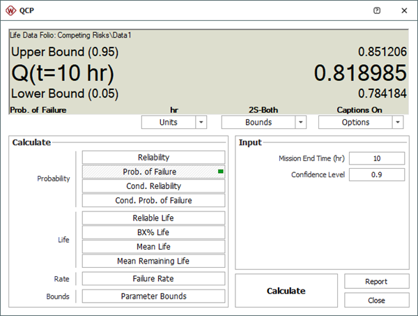 Using the QCP to calculate the probability of failure at 10 hours with 2-sided confidence bounds shows that the probability of failure at 10 hours is 81.90%.