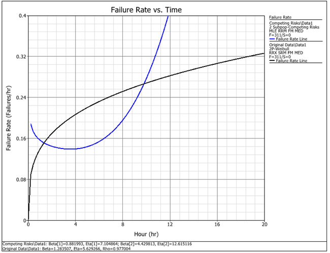 By comparing the two failure rate plots you can see that the Competing Risks distribution more accurately models the bathtub curve that is expected based on engineering knowledge.