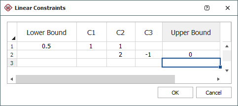 Each row in the Linear Constraints window represents an equation that defines a single constraint. The first and last columns represent lower/upper bounds of the constraint, and the middle columns represent the coefficients of each component in the blend (the column headers show the abbreviated factor names). If a constraint lacks a lower or upper bound, or if there certain components that are not considered, you can leave those cells blank.