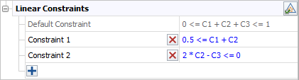 When you're creating an extreme vertex design, constraints like these are defined by opening the Linear Constraints window. To do this, click the Additional Settings heading on the navigation panel, and then click the [+] icon under Linear Constraints. To remove a constraint, click the [-] icon next to it.