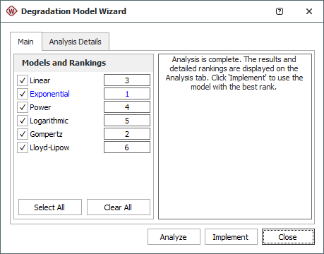 - On the Main tab of the Degradation Model wizard, select the models you would like to consider. The available models will vary depending on which degradation analysis folio you are working with.