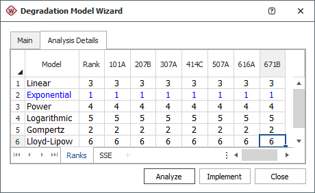 - The Ranks sheet displays the overall ranking as well as the ranking for each model and unit ID based on the SSE evaluation. Due to the randomness of materials, a model that is good for one unit may not be the best for the other units. In the example shown next, the exponential model is the best model for analyzing the data collected for all devices, while the Gompertz model is the second best fit for all devices.
