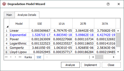 The wizard uses the Sum of Square Error (SSE) to evaluate the fit of the data. The calculations behind the ranking can be viewed on the Analysis Details tab, which contains two data sheets: