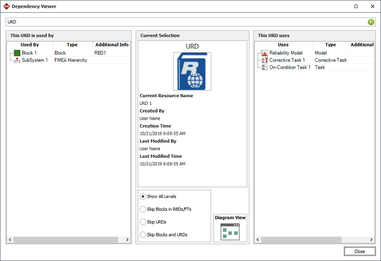 In the Current Selection area, you can choose what is shown in the This [resource] is used by area. You have the option to skip the URD and/or the block that the resource is used by. For example, the image below shows the connections among analyses and resources that we have been discussing. If you have selected to show all levels, you can trace from Reliability Model to URD 1 to Block 1 to RBD1. But if you have selected Skip Blocks and RBDs, it just shows that Reliability Model is used by RBD1.