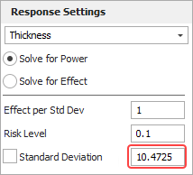Note that the detection power is calculated in terms of the effect per standard deviation (i.e., the amount by which the effect exceeds the standard deviation, whatever it is), so the standard deviation itself does not affect the calculation when you solve for power. However, in this case, the total effect (Effect per Std Dev * Standard Deviation) will be shown in the Power Study table in the detailed results.