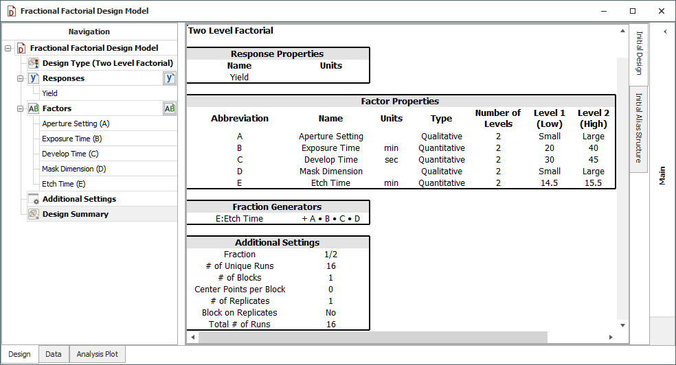 If you are using a two level factorial design with aliased factors (i.e., two level fractional factorial design), the summary will consist of two pages, accessed by clicking two tabs. The first tab will display the design properties summary and the second tab will display the initial alias structure, which describes which effects are indistinguishable from other effects in the current design. The alias structure is set automatically, but it can be changed by manually specifying generators.