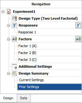 If the Design tab is out of sync with the Data tab (as indicated at the top of the Design tab control panel), two summaries will be available under the Design Summary heading. The Current Settings summary provides information about the settings currently selected on the Design tab (as described above). The Prior Settings summary provides a record of the design settings that were originally used to build the experiment plan.