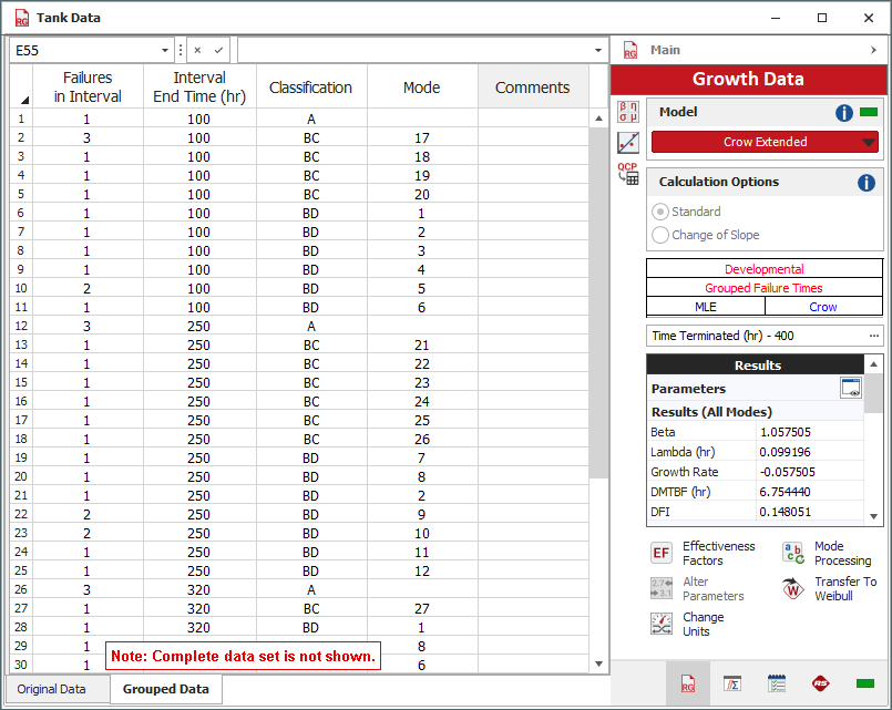 The "Tank Data" growth data folio contains the failure times observed during the test. The first data sheet (called "Original Data") contains the exact failure times. To create the second sheet (called "Grouped Data"), the analyst simply opened the original data sheet and clicked the Link Mission Profile icon on the control panel.