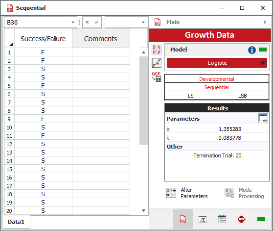 Choose the Logistic model, and then analyze the data set by choosing Growth Data > Analysis > Calculate or by clicking the icon on the Main page of the control panel.