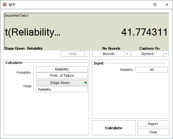 In the QCP, select to calculate the Stage Given Reliability, and then enter 0.95. Select Hour for the time units and click Calculate to obtain the result. The result indicates that if the reliability keeps its trend, it is expected to reach 95% at the 42nd stage of testing, as shown next.