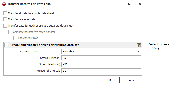 - Create and transfer a stress distribution data set calculates the product's unreliability at the specified time and at different stress intervals. The stress intervals will range from the use stress level to the maximum stress level used in the test, with equal increments in between. This information will then be exported to a free-form data sheet in a new life data folio. In multi-stress situations, you can click the Select Stress to Vary icon to select which stress type will be varied in the software's unreliability calculations. The remaining stress types will be fixed at their specified use stress values.
