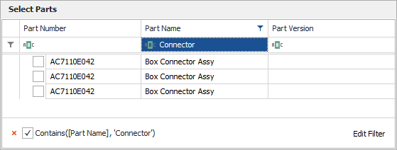 In the XFRACAS to RDW window, choose an Entity to import from, then select the check box for each part that you want to extract the incident (i.e., failure) data. If needed, you can use the Auto Filter Row to filter the grid by matching text in one or more columns. (For extremely large data sets, this row will be hidden and a Filter window will be available instead.)