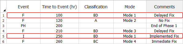 The increased flexibility for the treatment of BD failure modes means that the data set can also contain the exact times when the delayed fixes are implemented. Use the I – Implemented Fix event code to indicate the time of a delayed fix. The I event must have the exact same classification and mode as the prior failure event (F, P or Q). For example, the following picture shows a highly simplified data set where Mode 1 occurs at 100 hours but the fix is delayed. The first test phase ends at 200 hours and then the fix for Mode 1 is implemented during the second phase, at 250 hours of total test time.