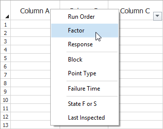 The following kinds of information can be recorded in each column. To calculate, there must be at least one Factor column and at least one Response or Failure Time column. All the possible columns are described next.