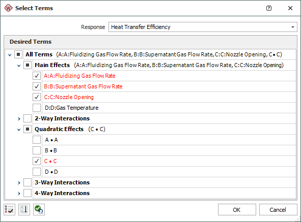 For terms to be included in the analysis of the heat transfer efficiency response were selected by clicking the Select Terms icon.