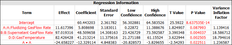 For the second response, the main effects of factors A, B and D were selected; the interaction effects AB and BD were selected; and the quadratic effects AA and DD were selected. Click the Calculate icon to analyze both responses.