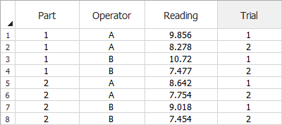 As an example, suppose a scale used to weigh two parts (in pounds). Part 1 is measured four times: twice by Operator A and twice by Operator B. Part 2 is also measured twice by each operator. The resulting data is shown next. For example, the first row shows that Part 1 was measured by Operator A, who obtained a measurement of 9.856 pounds.