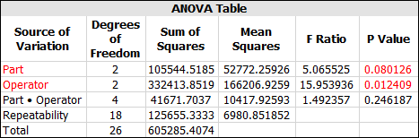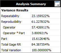 Click the View Analysis Summary icon to view the results in detail. The ANOVA table indicates that both the part and operator have a significant influence on the measurement variation.