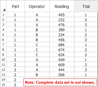 The data set for this example has been entered on the Data tab of the folio. There are 3 parts and 3 operators in the experiment. Each operator measured each part 3 times. The first 15 rows are shown next.