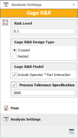 On the Analysis Settings page of the control panel, the risk level and design type are specified. In addition, the operator * part interaction is selected to be included in the analysis, and the process tolerance specification is specified.