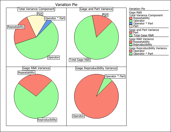 To further examine the breakdown of difference sources of measurement variation, click the Plot icon and view the variation pie charts to see the contribution of each variance component. The charts are shown next.
