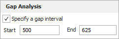 Return to the data sheet. On the Analysis page of the control panel, select the Specify a gap interval check box and then enter 500 to 625 for the gap interval, as shown next.