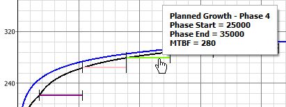 - Planned Growth lines display information for each phase of testing (and thus are available only when you have provided information for each phase). These horizontal lines mark the time when each phase will begin and end, while the vertical position of each line shows the expected value of the metric at the beginning of the phase. You can point to the line to see the specific values. (Note that in the continuous growth planning folio, you can show confidence bounds on the planned growth lines, but only when you have at least 3 test phases specified on the folio's data sheet.)