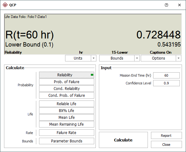 - Click Calculate to obtain the results, as shown next. The result shows that the reliability of the prototype device at 60 hours is 72.84%. The lower one-sided 90% confidence bound is estimated to be 54.32%. This means that there is 90% probability that the reliability of the device will be at least 54.32% at the end of 60 hours of operation.