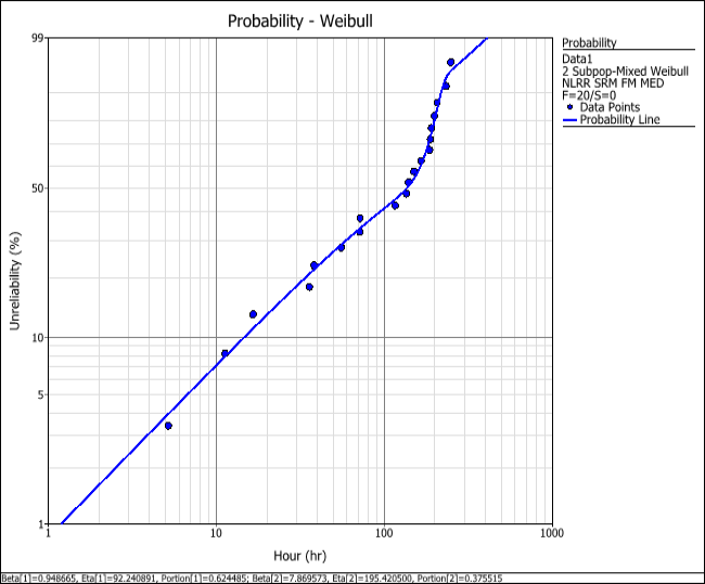 Note that the mixed Weibull analysis method does not specify which data point belongs to which subpopulation. If reliability predictions are needed at the subpopulation level, you will need to gather additional information in order to identify which data point belongs to which subpopulation.