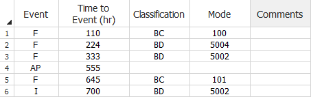 The following example shows the failure times of a single system, entered cumulatively. The Event column specifies the type of event the data point represents. See Event Codes for Multi-Phase Data for information on all seven possible event types. In the following data sheet, F = failure time, AP = analysis point (i.e., a designated time at which calculations will be performed and results obtained), and I = the time when the fix for a particular failure mode was implemented. The Classification and Mode columns are for identifying and classifying the failure mode that is responsible for the failure (for F, P or Q events) or the mode that received a fix (for I events).