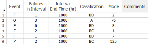 The following example shows the total test time at the end of each interval and the number of failures that occurred in each interval. The Event column specifies the type of event the data point represents. See Event Codes for Multi-Phase Data for information on all seven possible event types. In the following data sheet, F = failure time, Q = quality-related issue and P = performance-related issue. The Classification and Mode columns are for identifying and classifying the failure mode that is responsible for the failure (for F, P or Q events) or the mode that received a fix (for I events).