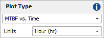 In the Multi-Phase Plot window’s control panel, the Plot Type drop-down list allows you to select whether the plot will display the mean time between failures (MTBF) or failure intensity, while the Units drop-down list allows you to select the units, which are defined at the database level.