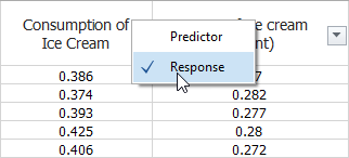 - Click the arrow inside a heading to specify whether the column contains predictor data (e.g., mean temperature) or response data (i.e., ice cream consumption).