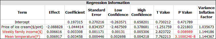The Regression Information table indicates that weekly family income and mean temperature are good predictors for ice cream production.