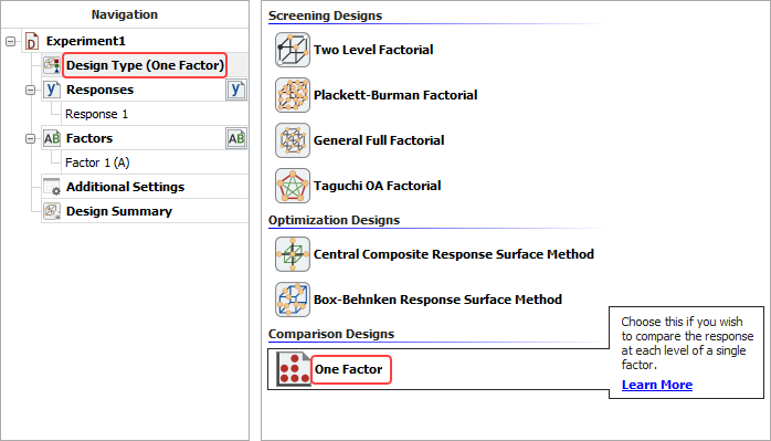 - Click Design Type in the folio's navigation panel, and then select One Factor in the input panel.