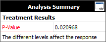 The result in the Analysis Summary area show that the p value is 0.0210. In other words, there is a 2.1% chance that the variation would be observed in the case when there is no significant difference between the response levels. Since the p value is less than the risk level (10%) entered on the Analysis Settings tab of the control panel, the conclusion is that the different factor levels (i.e., operators) do affect the response.