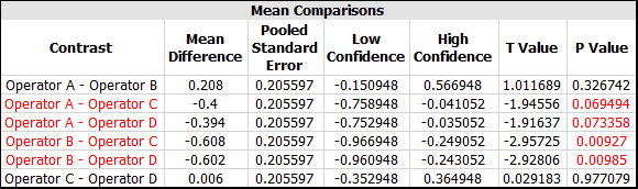 The compared factor levels are listed in the Contrast column (e.g., "Operator A - Operator B" is the comparison of those two operators). When a p value is red, the compared levels are significantly different. For example, there is a significant difference between Operator A and Operator C, but there is no significant difference between Operator A and Operator B.