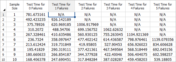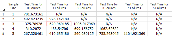 - Test time for given sample size solves for the test time given a range of sample sizes. When you select this option, the Sample Size Range area will require that you enter a starting sample size, an ending sample size and an increment value by which the sample will increase in the table.
