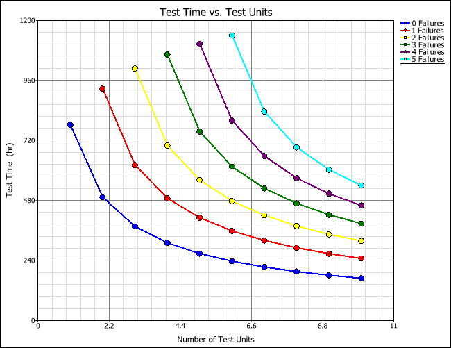 To view a plot of the table results, click Redraw Plot. Each colored line in the plot corresponds to a specific number of failures; this depicts how the allowed number of failures influences the test time and the required sample size.